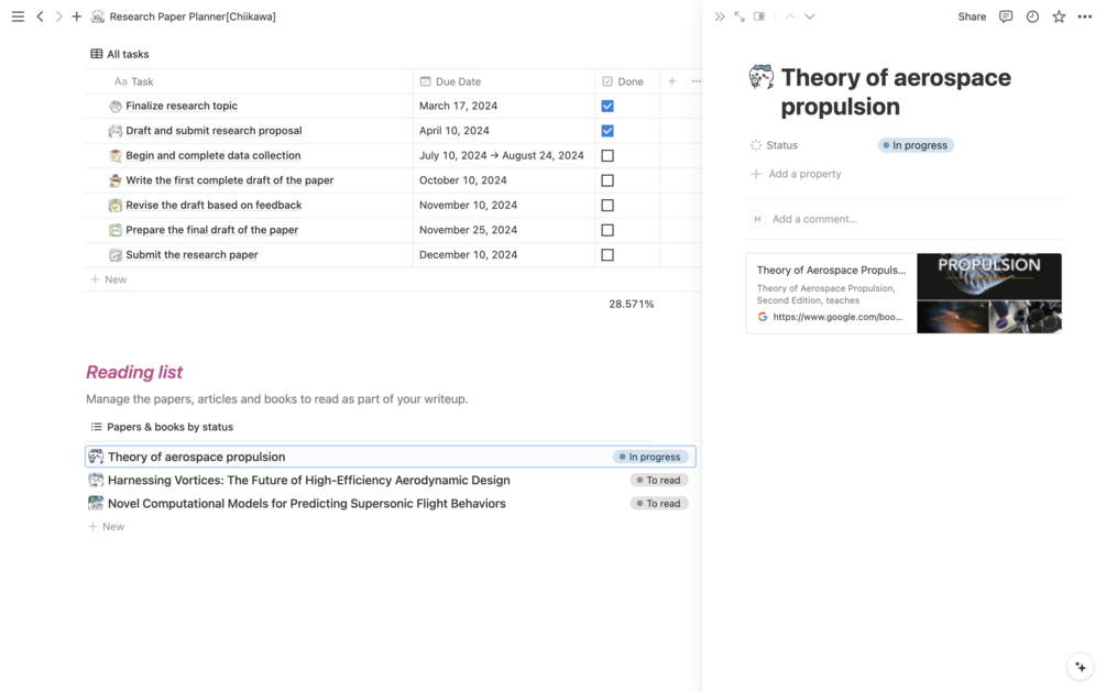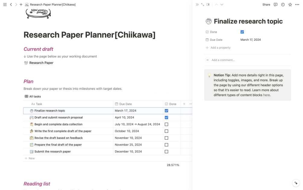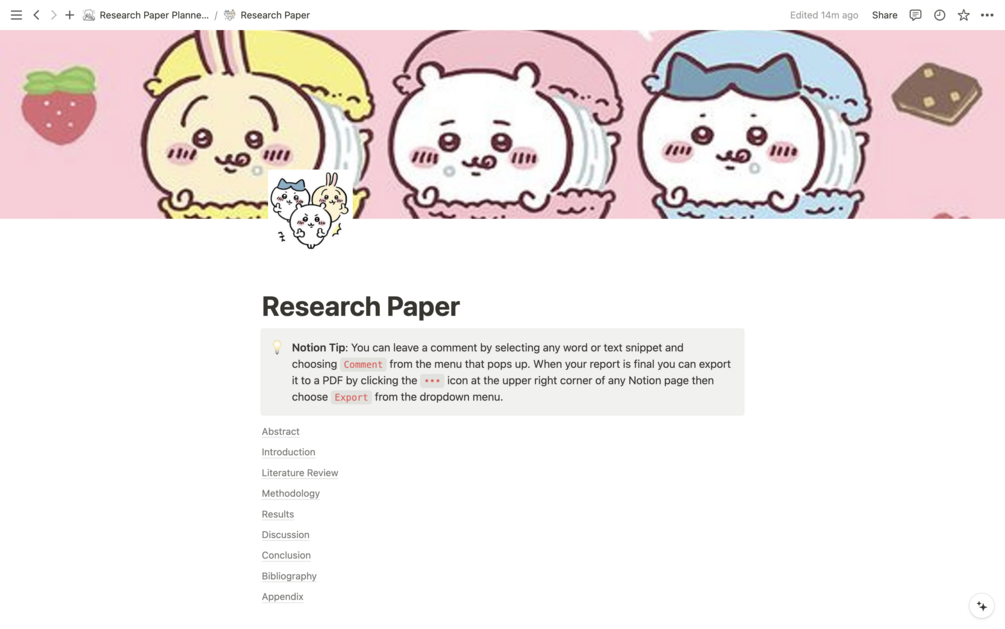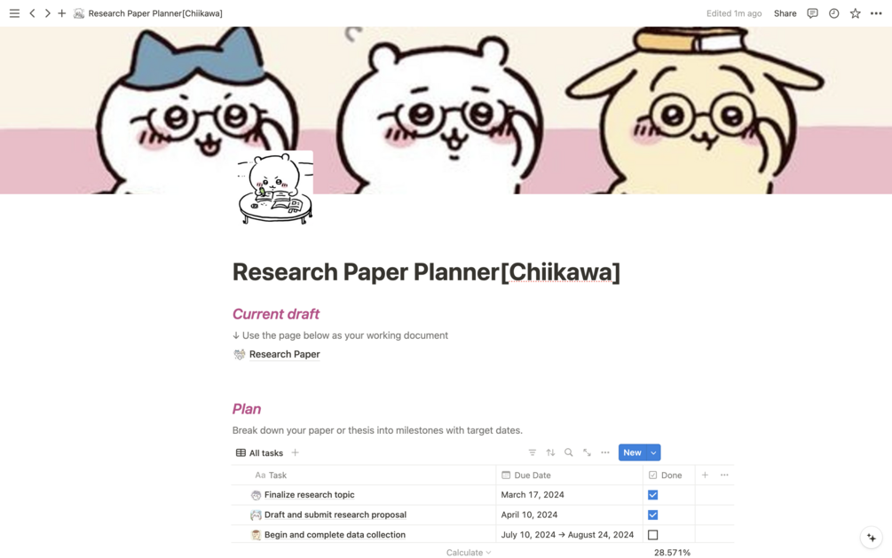Research Paper Planner[Chiikawa] provides a delightful and efficient method to manage your research paper. This template draws inspiration from notion's original free Research Paper Planner while incorporating a captivating makeover with the beloved characters from Chiikawa. I assure you that you will have an excellent experience using it.